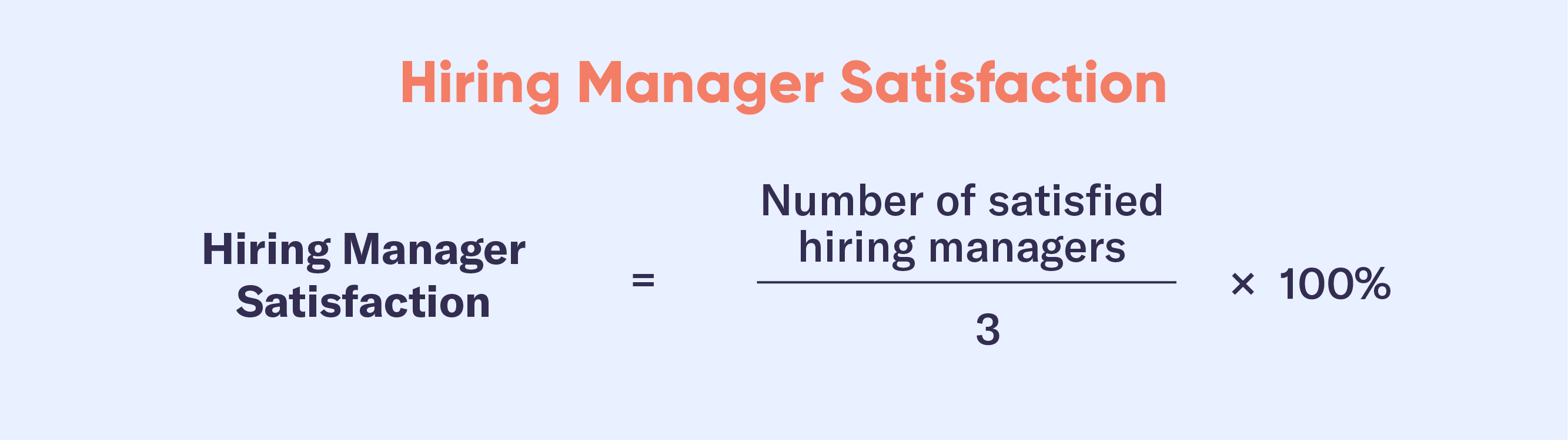 Formula: To calculate average hiring manager satisfaction, divide the number of satisfied hiring managers in a certain period (those having mostly E and M survey responses) by the total number of hiring managers and multiply the result by 100%.
